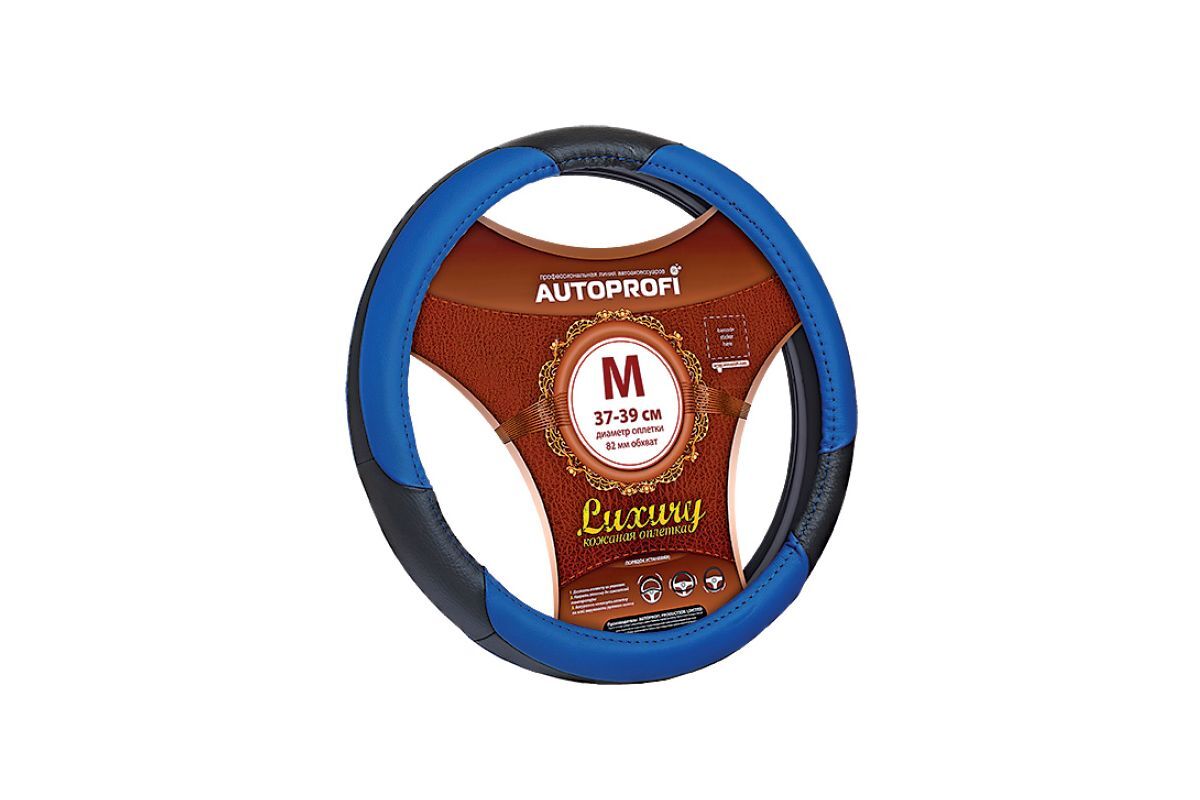 Оплетка руля Autoprofi LUXURY AP-1010 BK/BL (M) черно/синяя натуральная кожа 3 вставки из PU кожи